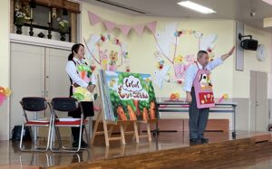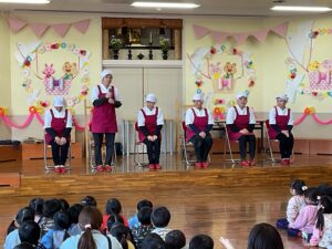 今日は給食を提供してくださるラクラクの栄養士さんによる、食育指導が行われました。朝ごはんを食べる大切さや食べ物の種類を指導して下さいました。